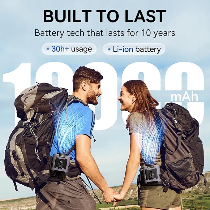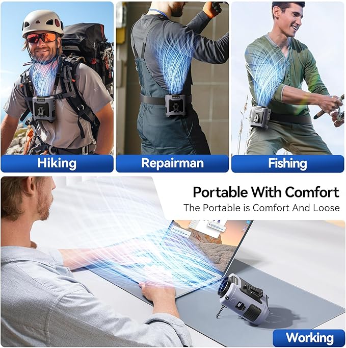 - Portable Waist Fan with 24-Hour Long Working Time: With a 10000mAh battery, this outdoor portable waist fan provides up to 24 hours of continuous cooling.