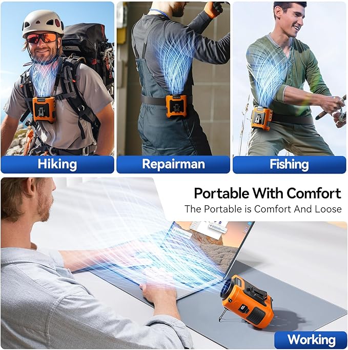 - Portable Waist Fan with 24-Hour Long Working Time: With a 10000mAh battery, this outdoor portable waist fan provides up to 24 hours of continuous cooling.