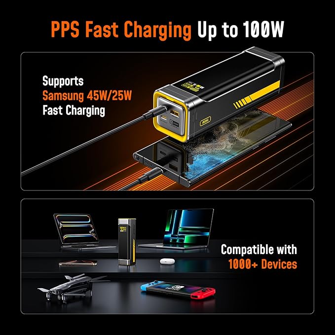 - 27,600mAh Ultra-High Capacity – Power That Lasts: With a massive 27,600mAh capacity, the AOHI Future Starship power bank can recharge an iPhone 16 up to 5.6 times or a 12.9" iPad Pro about twice, or a MacBook Pro 16" approximately one times, ensuring your devices stay powered during long trips and heavy use. Plus, with a 99.36Wh rating, it complies with TSA regulations (<100Wh), making it safe for carry-on luggage when traveling by air. This high-capacity power bank provides reliable power for a variety of devices, ensuring you’re never caught without backup when you need it most