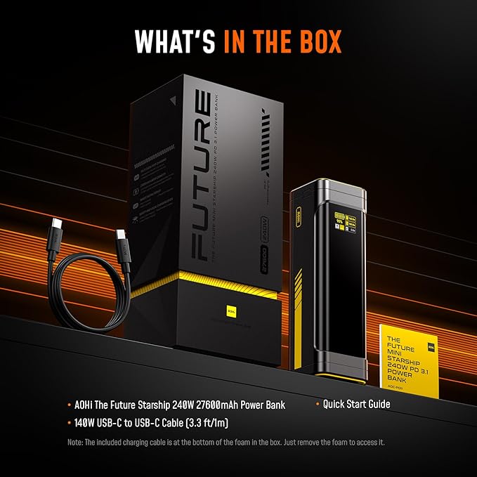- 240W Total Output, Power Everything, Anywhere: Equipped with cutting-edge PD 3.1 fast charging technology, This AOHI the Future Starship power bank delivers an impressive 240W total output, featuring dual USB-C ports with up to 140W max output and an additional USB-A port with up to 22.5W max output. This portable power bank can charge two laptops at once—when USB-C 1 delivers 140W, USB-C 2 can provide up to 100W max. If you need a quick boost for your device, this battery pack can power up a 16" MacBook Pro from 0% to 50% in just 28 minutes, keeping your workflow and entertainment uninterrupted. Whether you're working, traveling, or gaming, this is the ultimate charging companion