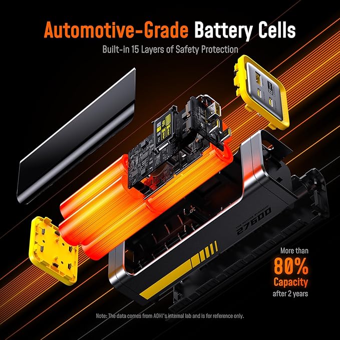 - High-Quality Battery Core with Multiple Safety Protection: AOHI Starship camping power bank uses automotive-grade battery cells that are known for its safety and and industry-leading efficiency. it's built to last with over 1000 charge cycles, which is over 3 times the lifespan of ordinary power banks. Equipped with the newly upgraded AOHICE 3.0 temperature control technology, it ensures real-time temperature control and rapid heat dissipation while delivering high-power output. Additionally, 15 layers of built-in safety protection safeguard the Starship power bank, your devices, and you
