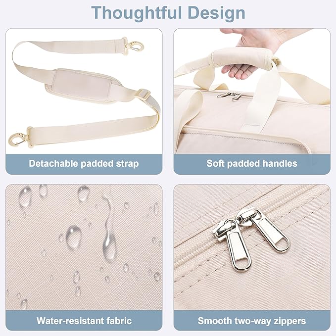 - [ Thoughtful Design ] : The side shoe compartment has two exclusive ventilated air vents and can also be used as a dirty laundry compartment, water & odor resistant. 1 zipper pocket as sleeve on the back of the duffle is designed to keep the bag secure when put over the telescoping handle of a suitcase. The grip and shoulder straps are all padded to reduce the burden on the hands or shoulders.