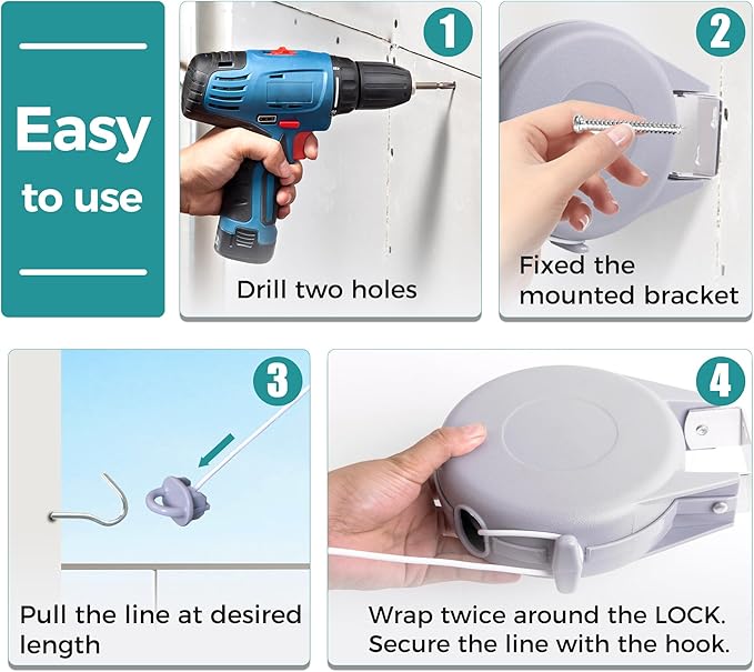 - EASY TO USE – Install our heavy-duty retractable single line effortlessly within seconds. Simply pull the rope to your desired length using the Lock Button. After use, retract the line to save space. No more hauling heavy laundry loads!