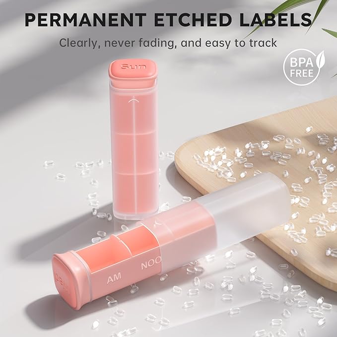 - Time-Saving & Easy to Track: The supplement organizer use intaglio printing—weekdays + AM/NOON/PM are marked on top and inside, easy to see and won't rub off. You only need to refill your meds once a week, no daily top-ups
