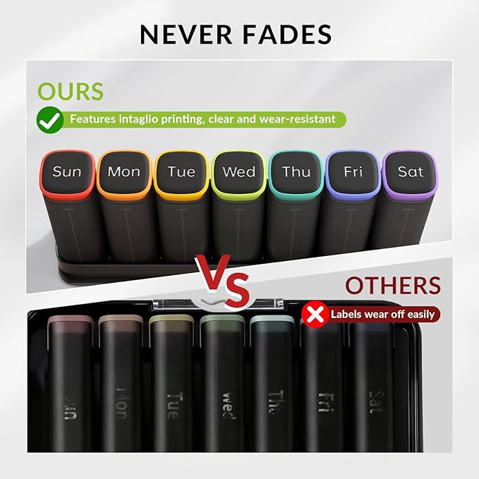 - Time-Saving & Easy to Track: The supplement organizer use intaglio printing—weekdays + AM/NOON/PM are marked on top and inside, easy to see and won't rub off. You only need to refill your meds once a week, no daily top-ups
