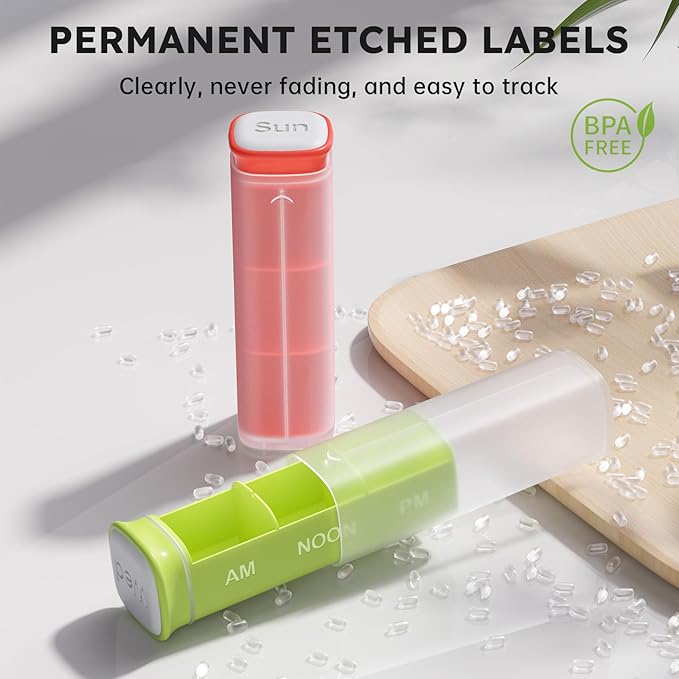 - Time-Saving & Easy to Track: The supplement organizer use intaglio printing—weekdays + AM/NOON/PM are marked on top and inside, easy to see and won't rub off. You only need to refill your meds once a week, no daily top-ups