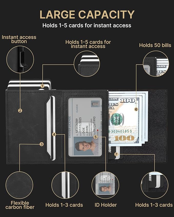 - 𝗘𝗳𝗳𝗶𝗰𝗶𝗲𝗻𝘁 𝗖𝗮𝗿𝗱 𝗔𝗰𝗰𝗲𝘀𝘀: Designed for speed, this wallet's Smart Pop Up mechanism allows you to instantly view and select your cards.