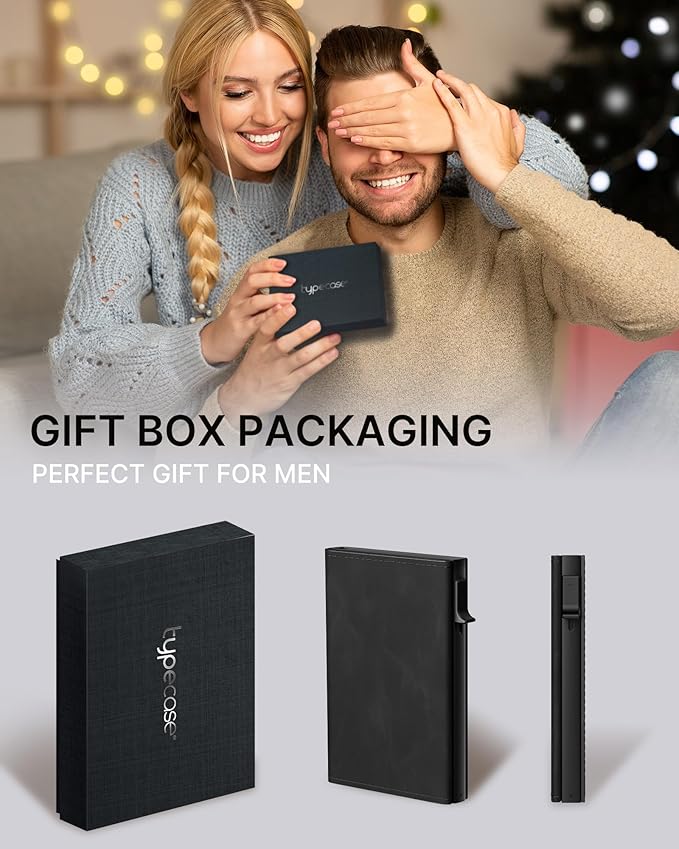 typecase Mens Wallet Card Holder: Pop Up Aluminum Case, Genuine Leather, Smart, RFID Blocking, Slim, Minimalist, Front Pocket - 9-14 Card Capacity | ID Window | Cash Slot - Oil Wax Black