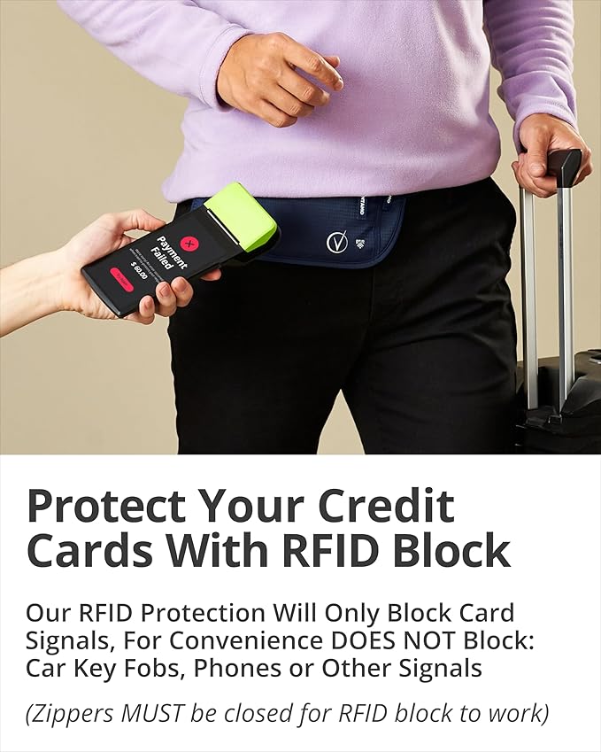 - Featuring advanced protection RFID-blocking technology, this money belt for men and women protects your credit cards from electronic theft. Whether used as a slim travel passport holder or just a bag for daily use, it's ideal for keeping credit cards, IDs, and other sensitive items secure wherever you go.
