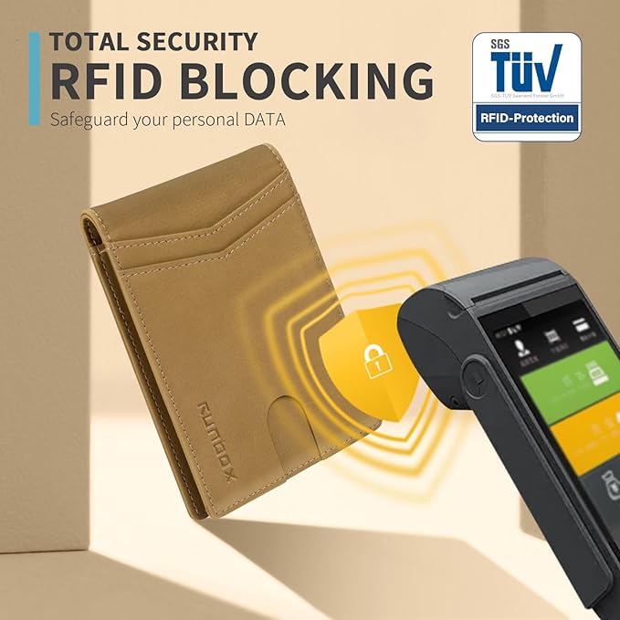 - RFID Blocking - Our wallets are equipped with advanced RFID SECURE Technology, a unique metal composite, engineered specifically to block 13.56 MHz or higher RFID signals and protect the valuable information stored on RFID chips from unauthorized scans. License and ID cards will be protected effectively. Blocking the 13.56 MHz band and protect against data theft by RFID scanners