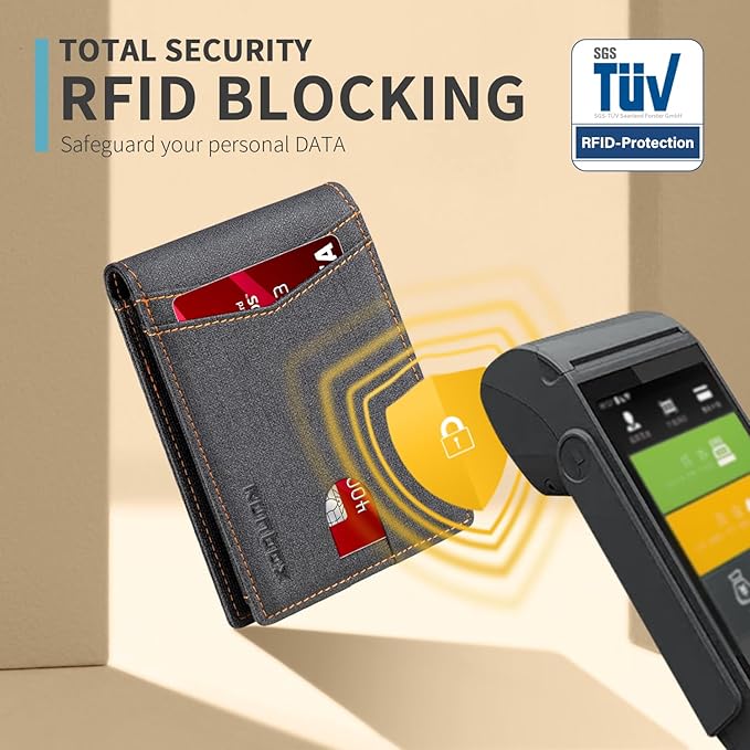- RFID Blocking - Our wallets are equipped with advanced RFID SECURE Technology, a unique metal composite, engineered specifically to block 13.56 MHz or higher RFID signals and protect the valuable information stored on RFID chips from unauthorized scans. License and ID cards will be protected effectively. Blocking the 13.56 MHz band and protect against data theft by RFID scanners