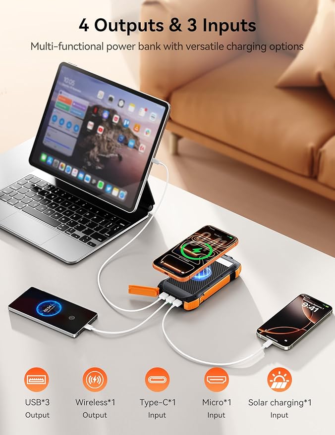 - 【Packing List & Excellent Service】What you will receive? 1X 40000mAh Wireless Solar Power Bank, 1X Charging Cable(19.6in), 1X User Manual,1x Lanyard.Our support team offer 24/7 service, if you have any questions, don't hesitate to contact us immediately, we will definitely provide you with the most satisfactory solution