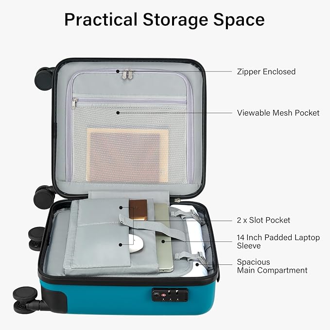 - 【Multiple Compartment】This luggage carry on with spacious main compartments and enclosed zipper compartment for clothes, then a mesh pocket on it. Features a padded laptop compartment that fits laptop up to 14 inches and 2 slot pockets.