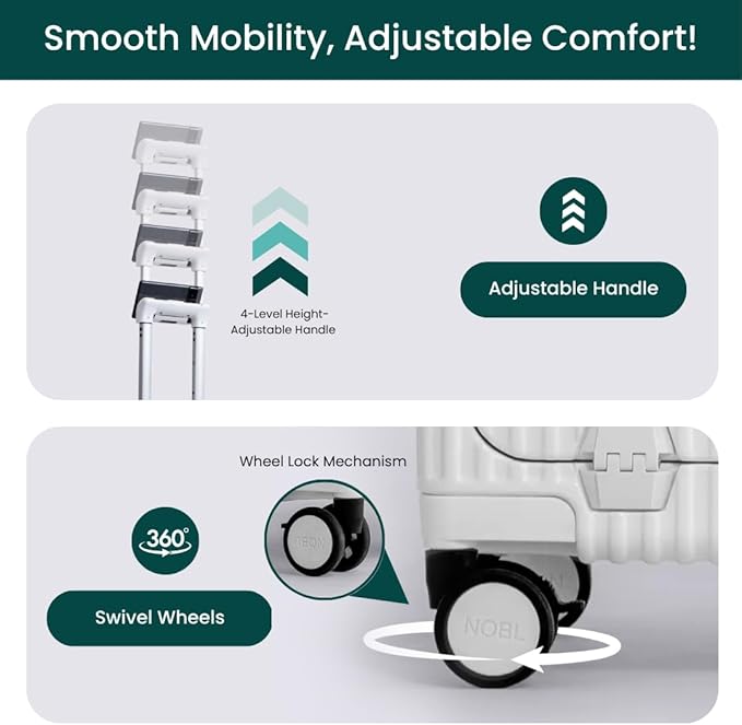 - Effortless Mobility & Comfort: 360° spinner rolling wheels glide smoothly, and the 4-level height adjustable handle ensures easy handling. Bag holder studs let you secure extra bags, perfect for business trips and weekend getaways.