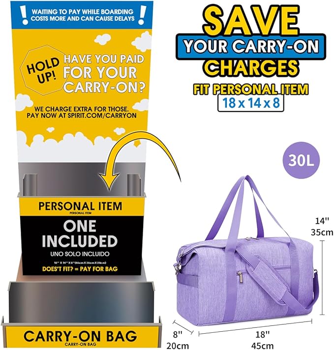 - Airline-friendly Travel Bag. Bag size 18x14x8 inch (Capacity 30L) fits personal item size 18x14x8 of Spirit Airlines & Frontier Airlines, which can be placed under seat and no need to pay carry-on. Wide-open 30L main compartment could accommodate all your travel items for 3 to 4 days or a week's worth of clothes