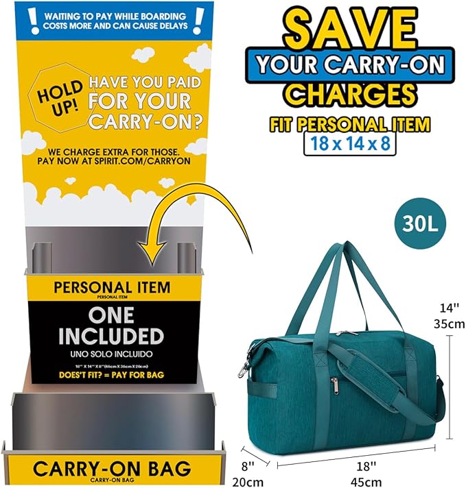 - Airline-friendly Travel Bag. Bag size 18x14x8 inch (Capacity 30L) fits personal item size 18x14x8 of Spirit Airlines & Frontier Airlines, which can be placed under seat and no need to pay carry-on. Wide-open 30L main compartment could accommodate all your travel items for 3 to 4 days or a week's worth of clothes