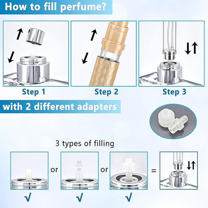 - Easy to fill - Place the travel bottle on top of the large perfume bottle, then just press a few times and you'll see it fills up the travel bottle. It comes with two different nozzle adaptors ensuring that you are able to easily fill the bottle