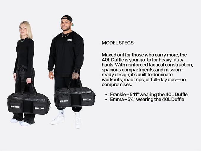 - CUSTOMIZABLE & FUNCTIONAL: This tactical duffle bag includes Molle straps for attaching extra gear like your lifting belt or gym mat. Dual cup holders keep you hydrated, and two included removable patches ("NEVER AVERAGE" and "ALWAYS A WOLF") allow you to personalize your style.