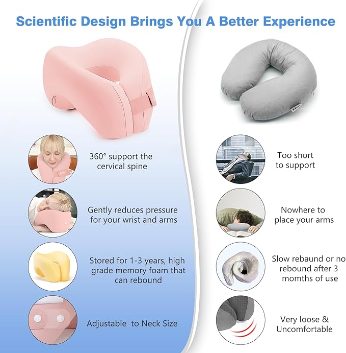 - 2-in-1 Pillow: As an neck pillow airplane, this memory foam travel pillow can better support your neck and shoulders, prevent your head from falling forward, and relieve neck pain during travel. As a napping pillow, it is designed with a perfect 45° angle, allowing your head and neck to naturally lean forward, minimizing arm pressure, reducing hand numbness, and providing a soothing sleep experience.