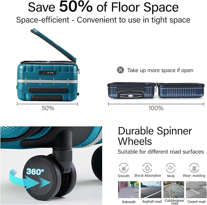 - 【CREATIVE FRONT OPENING】 Leading the future front opening and closing method which is effortless to open or close the suitcase, not only is it easy to load, but it also saves space. This design solves the problem that traditional luggage separated 2 compartments of heavy load then it's difficult to open and close. Importantly, it also prevents personal items from being displaced