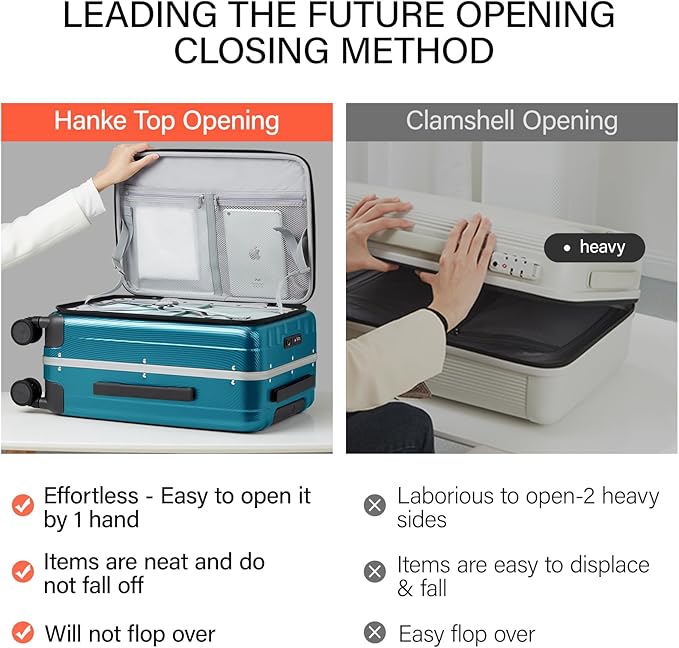 - 【CREATIVE FRONT OPENING】 Leading the future front opening and closing method which is effortless to open or close the suitcase, not only is it easy to load, but it also saves space. This design solves the problem that traditional luggage separated 2 compartments of heavy load then it's difficult to open and close. Importantly, it also prevents personal items from being displaced