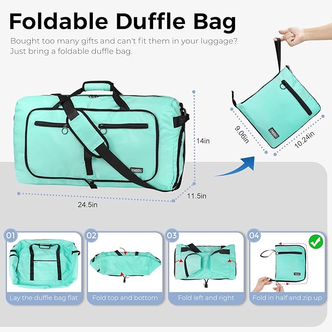 Fmeida 65L Duffle Bag with Shoes Compartment, Foldable Travel Duffel Bags for Men Women, Large Packable Travel Bag Water Repellent & Tear Resistant (Mint Green)