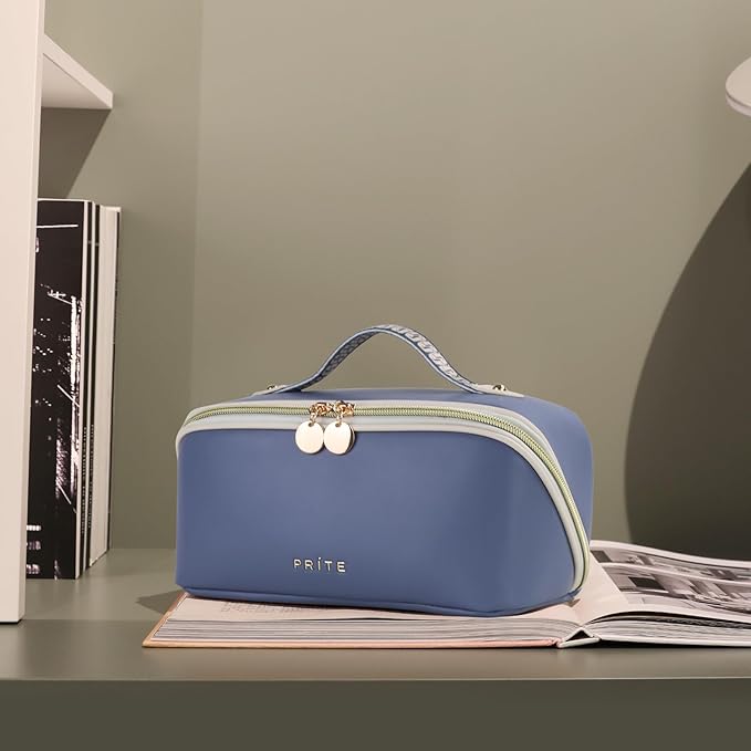Prite Makeup Bag for Women Travel Waterproof Vegan Leather Cosmetic Bag Open Flat Toiletry Bag With Clear Divider and Handle (Blue)
