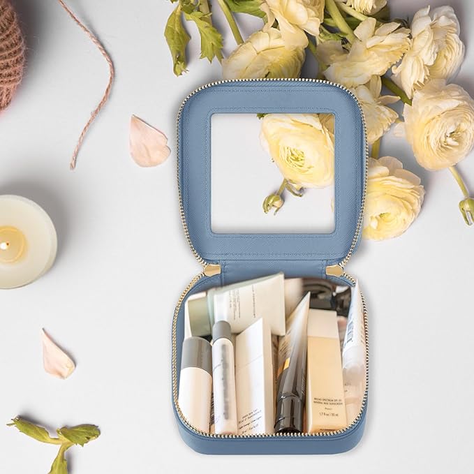 - 【ROOMY & STYLISH】 Measuring 5'' x 5'' x 2.1'', this makeup travel organizer embodies luxury and style. Its minimalist boxy design in a chic color exudes elegance; Crafted from exquisite Vegan leather and adorned with polished hardware