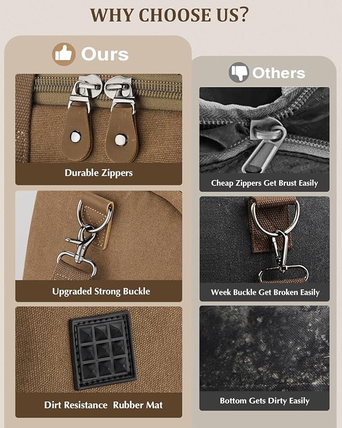 - Premium Materials: Crafted from water-resistant & tear-resistant canvas fabric, this overnight bag is built to withstand the rigors of daily use. Enhanced zippers provide durability for a seamlessly smooth user experience