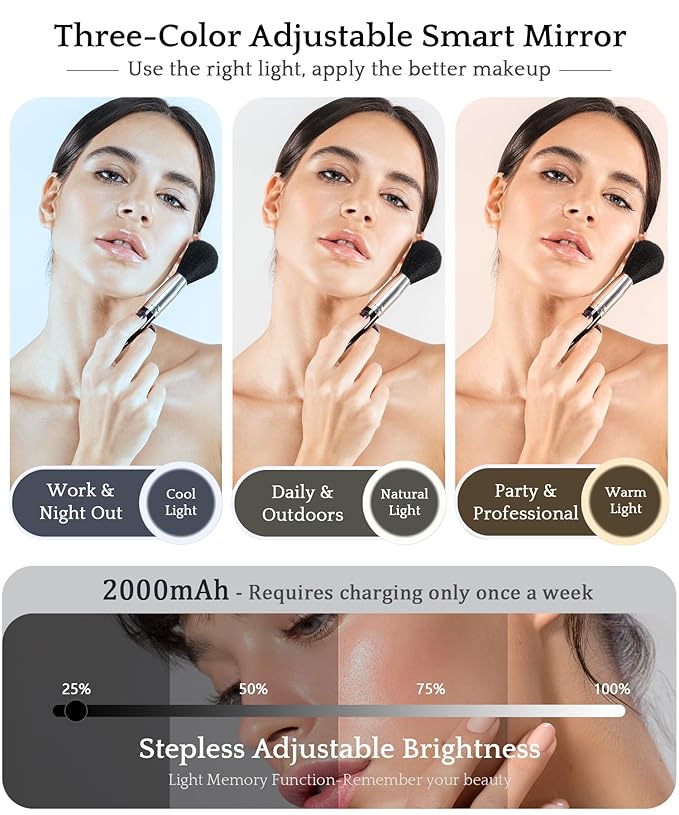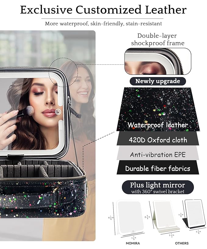 MOMIRA Travel Makeup Bag Cosmetic Bag with Lighted Mirror, Adjustable Brightness in 3 Color Scenarios/Detachable makeup mirror, 2024-All-round Upgrade, Waterproof, Gift for Women -Glett Black