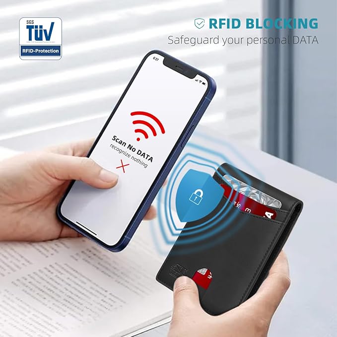 - CERTIFIED RFID SECURITY - Our card holder features German institute-certified RFID SECURE Technology, effectively blocking RFID signals at 13.56 MHz and above, safeguarding your chip-stored data from unauthorized scans