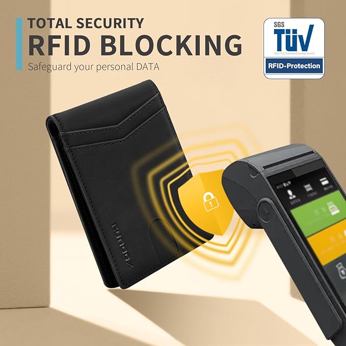 - RFID Blocking - Our wallets are equipped with advanced RFID SECURE Technology, a unique metal composite, engineered specifically to block 13.56 MHz or higher RFID signals and protect the valuable information stored on RFID chips from unauthorized scans. License and ID cards will be protected effectively. Blocking the 13.56 MHz band and protect against data theft by RFID scanners