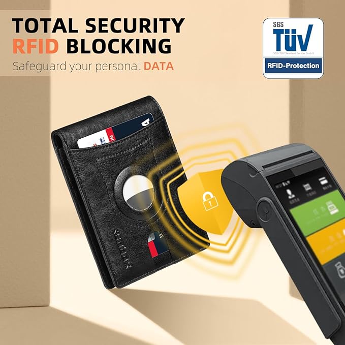 - RFID ANTI-THEFT FUNCTION - This wallet for AirTag boasts RFID blocking shield technology, safeguarding your personal and financial data against unauthorized scanning and identity theft. Enjoy peace of mind knowing that your information is safe and secure