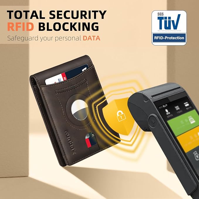 - RFID ANTI-THEFT FUNCTION - This wallet for AirTag boasts RFID blocking shield technology, safeguarding your personal and financial data against unauthorized scanning and identity theft. Enjoy peace of mind knowing that your information is safe and secure