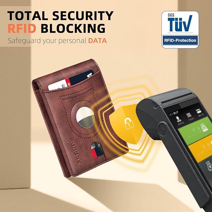 - RFID ANTI-THEFT FUNCTION - This wallet for AirTag boasts RFID blocking shield technology, safeguarding your personal and financial data against unauthorized scanning and identity theft. Enjoy peace of mind knowing that your information is safe and secure