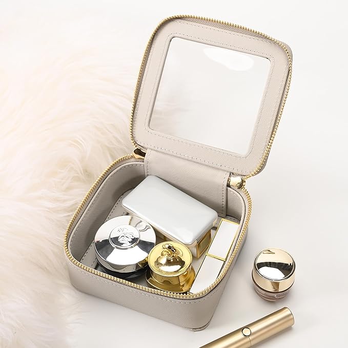 - ❤【LUXURY DESIGN】Unlike other flimsy clear makeup bags, our mini cosmetic case(measuring 5.2’*4.8’*2.6’) which made of premium saffiano PU leather and thick vinyl can keep a good structure and. The mini clear make up bag was designed into a minimalist boxy shape, crafted in beautiful PU leather and finished with polished hardware. Together with the beautiful stitches and whisper-quiet metal zippers, it’s durable for long-lasting use.
