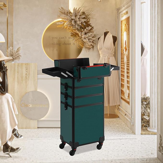 Makeup Train Case, Rolling Makeup Case with Lid, 5 in 1 Cosmetology Case on Wheels, Christmas Gift, Large Makeup Case Organizers, Profesional Cosmetic Case for Salon Barber, Black Green