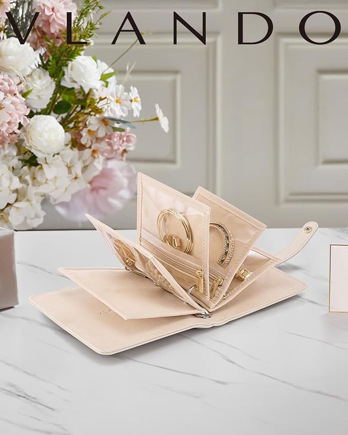 Vlando Travel Jewelry Organizer Case,Mothers Day Gifts for Her,Portable Jewelry Organizers Storage Book with Clear Zipper Velvet Jewelry Pouch Bag for Travel Essentials,Ring,Earring-Cream White