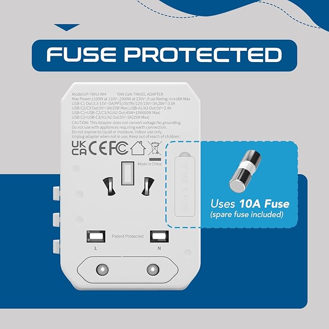- [SAFETY WITH COMPACT TRAVEL DESIGN]: Safest desgined in the USA Makes our adapters. The most reliable and No 1 adapters in the market Complete all in one Adaptor package. international travel charger is CE and RoHS certified. Its advanced safety features ensure your devices charge safely across multiple countries.