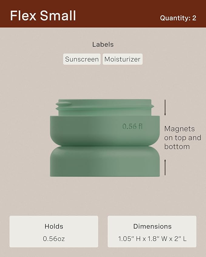 - PATENTED MAGNETIC DESIGN - Designed for seamless storage, our travel capsules feature a magnetic design that connects each container vertically or horizontally. They include magnetic labels that seamlessly swap between The Flex Small, The Flex Medium, and The Flex Large Capsules.