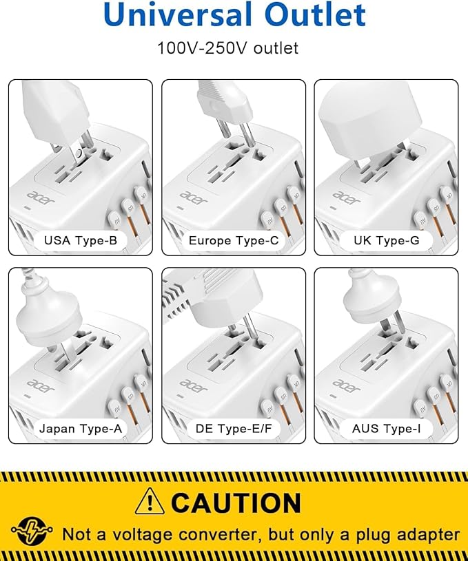Acer Universal Travel Plug Adapter - International Power Adapter with 5 USB Ports (3 USB C) 5.8A, Worldwide Outlet Charger for USA to European UK France Germany Spain, Type C/E/F/G/I/L/A, White
