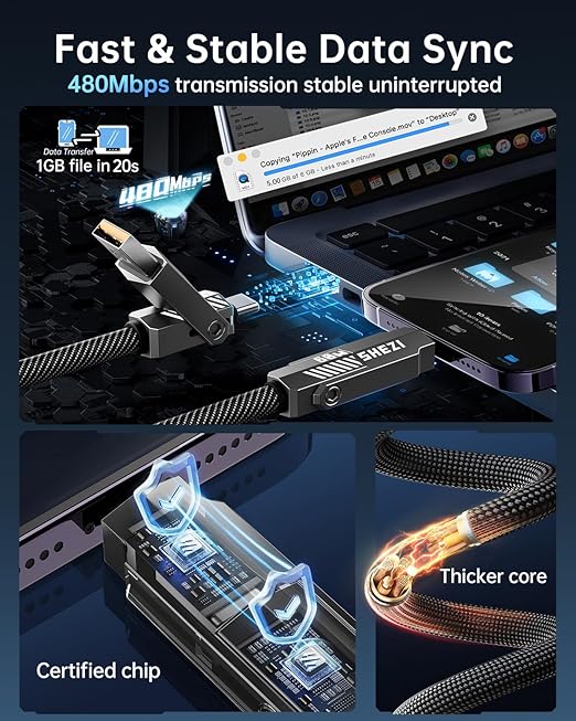 - Built to Last USB-C Cable: This multi-functional USB-C to USB-C cable is made of upgraded anti-tangle nylon braided and rust-proof zinc alloy connectors, ensuring it withstands daily wear and tear. With over 4,000 bend and plug/unplug tests, this 4 in 1 cable guarantees long-lasting durability even with frequent use.