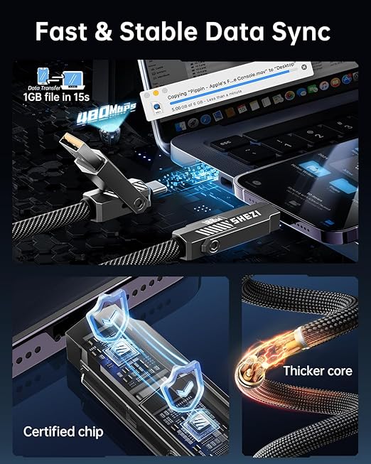 - Built to Last USB-C Cable: This multi-functional USB-C to USB-C cable is made of upgraded anti-tangle nylon braided and rust-proof zinc alloy connectors, ensuring it withstands daily wear and tear. With over 4,000 bend and plug/unplug tests, this 4 in 1 cable guarantees long-lasting durability even with frequent use.
