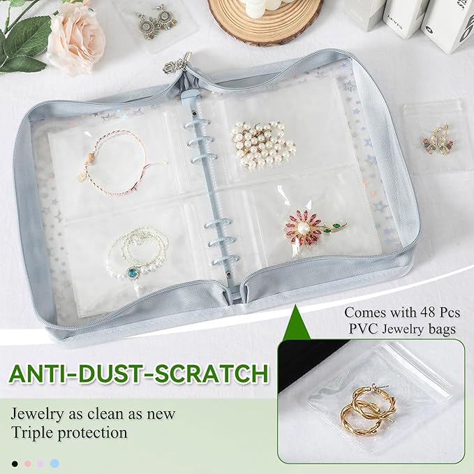 Jewelry Organizer Case Travel Clear Earring Organizer Case Transparent Jewelry Storage Book (Light blue, with 48 Pcs large Jewelry Pouches)