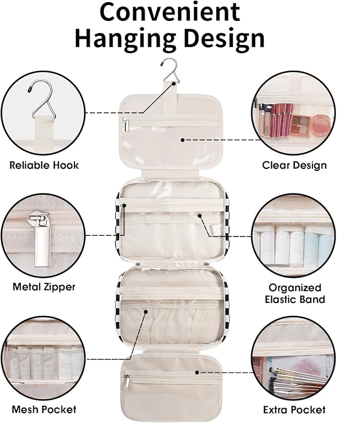 Narwey Travel Toiletry Bag for Women Large Hanging Makeup Bag Organizer Toiletries Bag for Full Size Essentials Accessories Cosmetics (Black Checkerboard (Large))