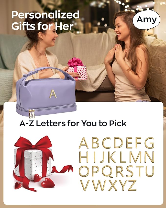- 【Double-layer Design】The monogrammed makeup bags is double-layer with a unique design of upper and lower storage areas. The bottom compartment is great for storing cosmetics, eye shadows, makeup brushes, and other items. The top layer features a large opening for easy access, along with two small compartments for lipsticks and earrings.