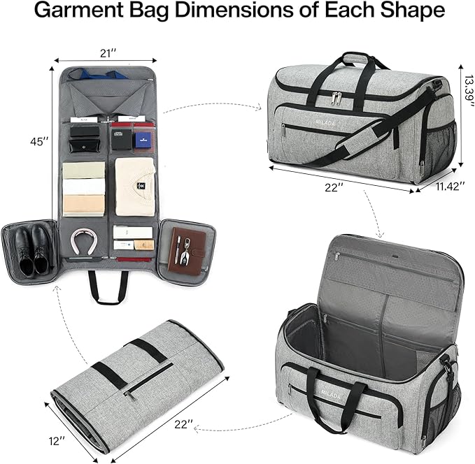 - 【2 IN 1 GARMENT BAG】With the fancy design of combining the feature of a travel garment bag and a suit bag travel. It can be a great garment bags for hanging clothes travel when you open this convertible duffle bag for travel and lay it out. Once zipped and assembled, this suit garment bag work perfect as a travel bag/suit bag. When not in use, it folds flat and doesn't take up much storage room