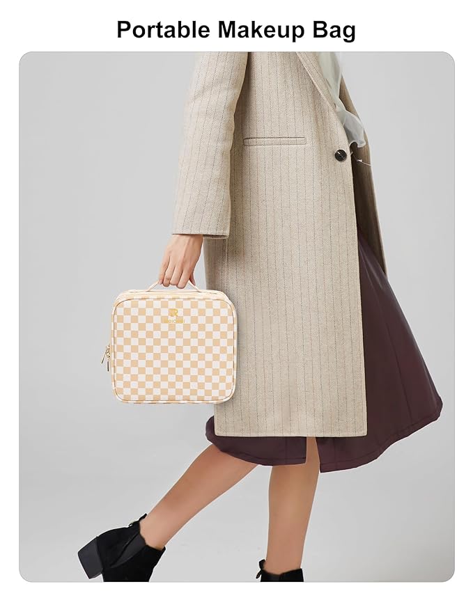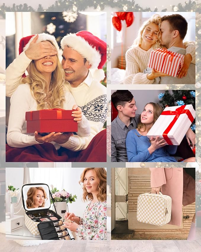 Relavel Travel Makeup Bag With LED Mirror, Cosmetic Train Case with Light up Mirror, Portable Makeup Artist Organizer Bag with Adjustable Dividers, Makeup Brush Holder Storage, Plaid