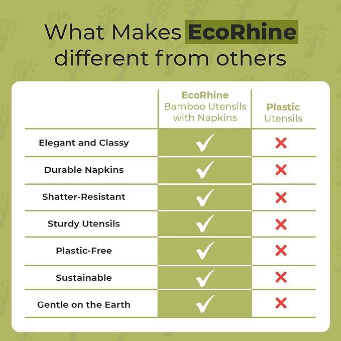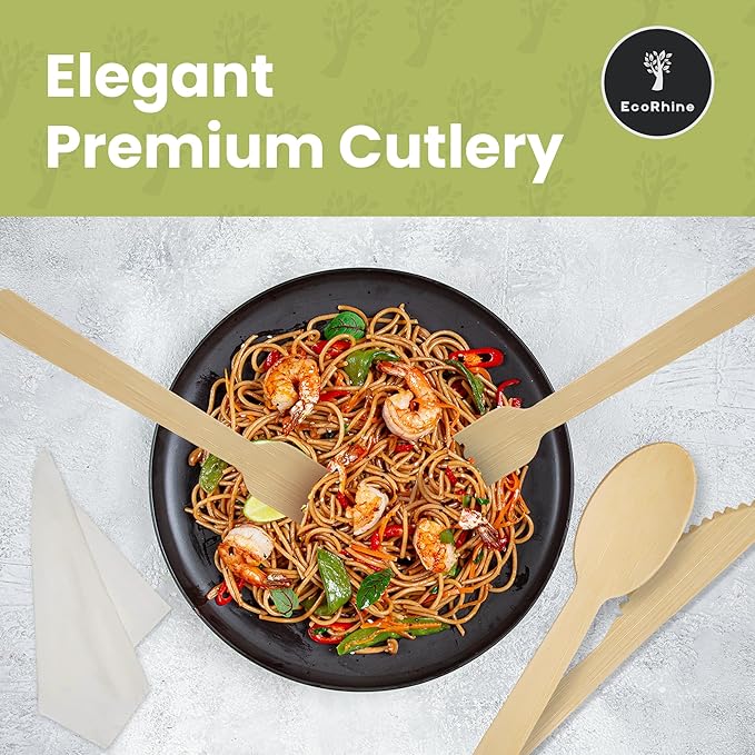 - Natural Look, Zero Plastic Waste: EcoRhine bamboo cutlery adds a warm, natural touch to any setting while staying completely plastic-free and biodegradable. These bamboo disposable utensils bring style and sustainability together at every meal.