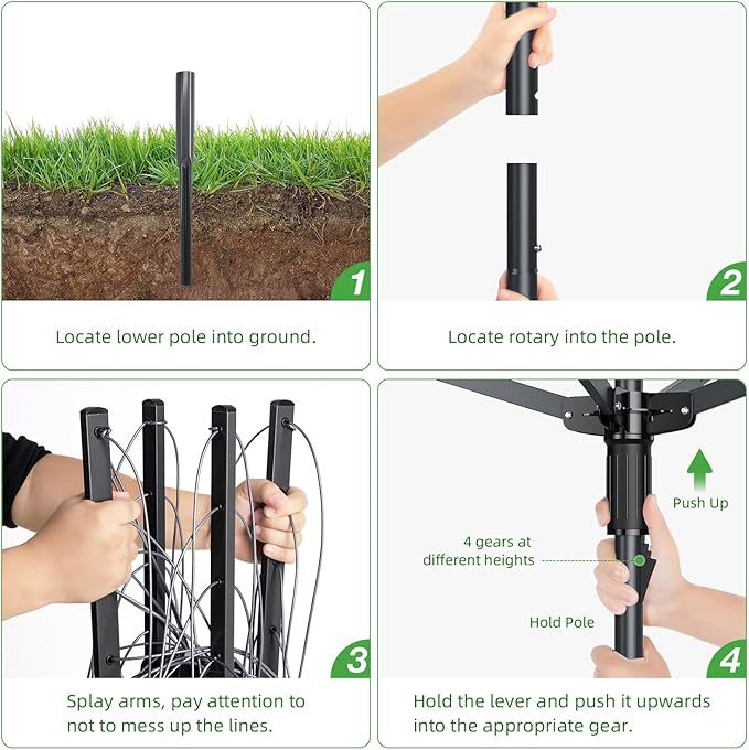 - Durable Structure: The rotary outdoor umbrella drying rack is made with heavy duty iron 4-arms which the surface spray treatment, strong and sturdy, and post create a stable laundry drying rack, perfect for handling large laundry loads, duvets, blankets, quilts, towels, dress and bedding etc. NOTE: Each Package includes a metal ground spike, a protective cover, a peg bag and 40pcs clothes pegs for easy using the umbrella drying rack.